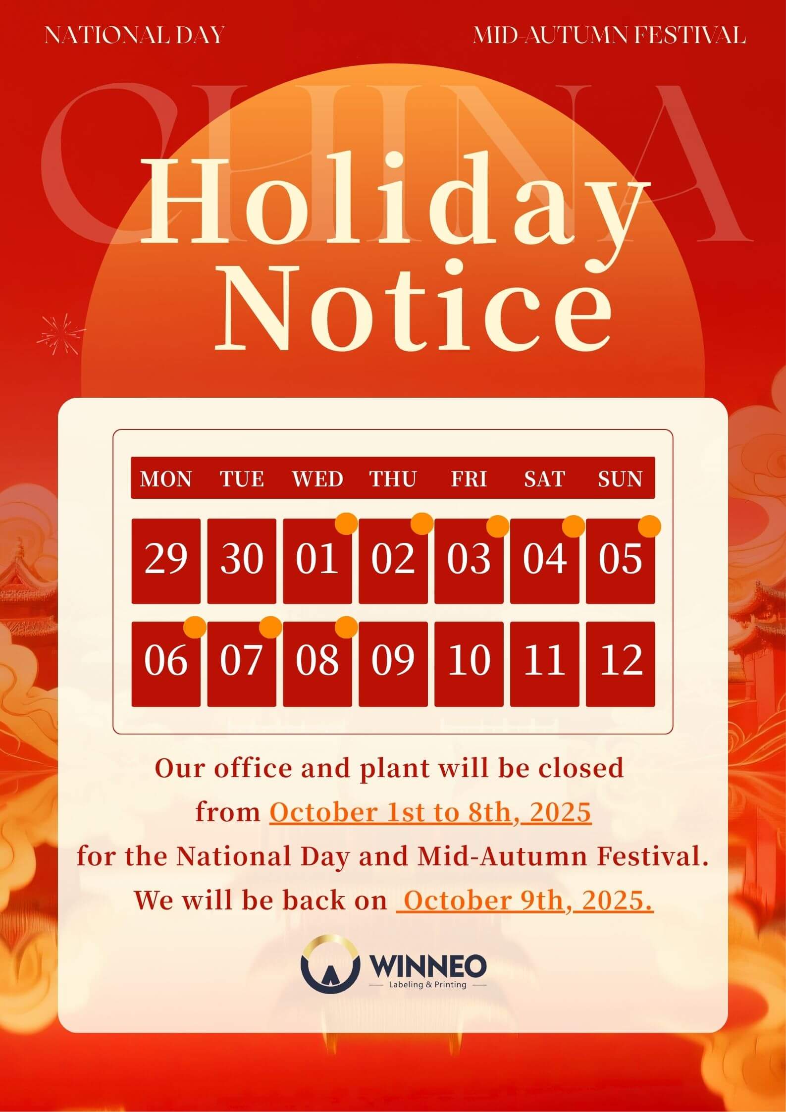 Les informamos que nuestra oficina permanecerá cerrada con motivo del Festival del Medio Otoño y el Día Nacional. Del 1 al 8 de octubre de 2025y reanudar el trabajo en 9 de octubre de 2025.