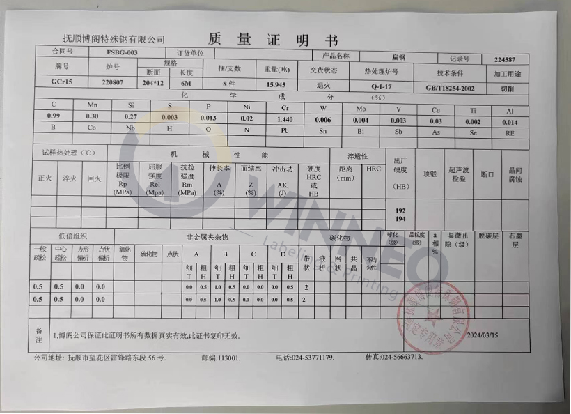 Este es el informe original de las pruebas de composición de las materias primas utilizadas en las planchas de tampografía WINNEO. Este informe demuestra que las materias primas utilizadas en nuestras planchas de tampografía cumplen con los estándares de calidad. La calidad de las materias primas garantiza que la fabricación posterior de las planchas de acero cumpla con las normas pertinentes.