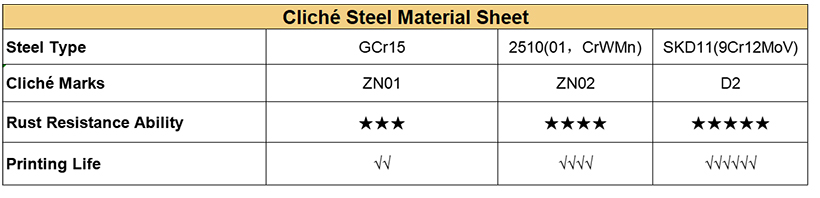 Generalmente fabricados con materiales como acero recubierto de aceite y acero cromado, alcanzan una dureza de HRC 63+/-1, lo que garantiza una resistencia al desgaste a largo plazo. Las placas de acero cromado pueden soportar entre 200.000 y 300.000 ciclos de impresión. Las placas de acero recubiertas de aceite pueden soportar más de 50.000 ciclos de impresión. Existen numerosos factores que afectan su vida útil. Este es un valor teórico comprobado, y la vida útil real prevalecerá.
