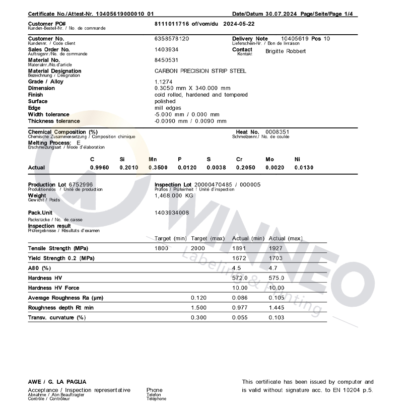 Este es el informe original de las pruebas de composición de las materias primas utilizadas en las planchas de tampografía WINNEO. Este informe demuestra que las materias primas utilizadas en nuestras planchas de tampografía cumplen con los estándares de calidad. La calidad de las materias primas garantiza que la fabricación posterior de las planchas de acero cumpla con las normas pertinentes.